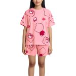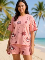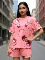 1 review for Women Summer Printed Short-sleeved T-shirt With Chest Pad + Shorts Combo Rose red strawberry bear