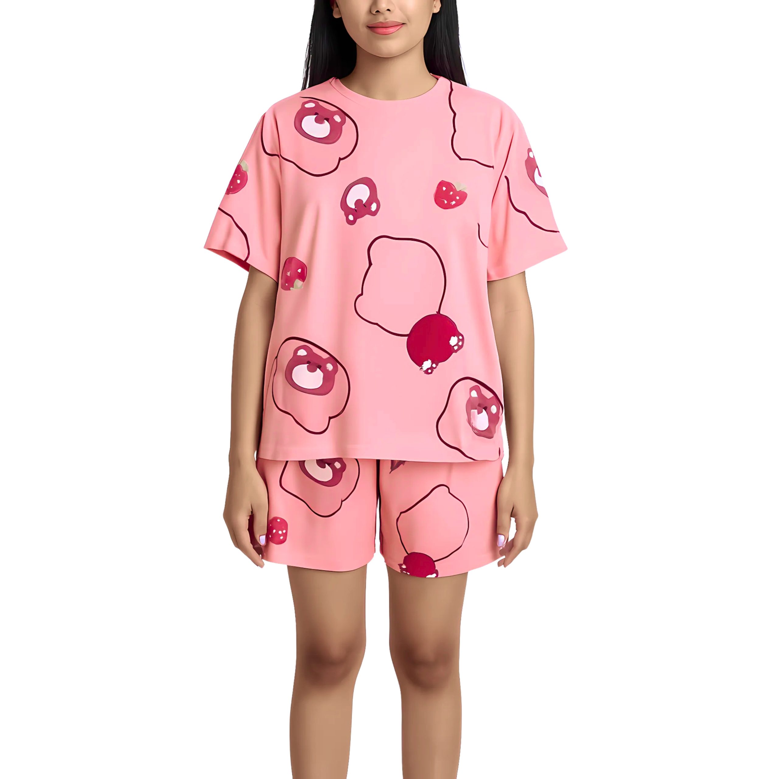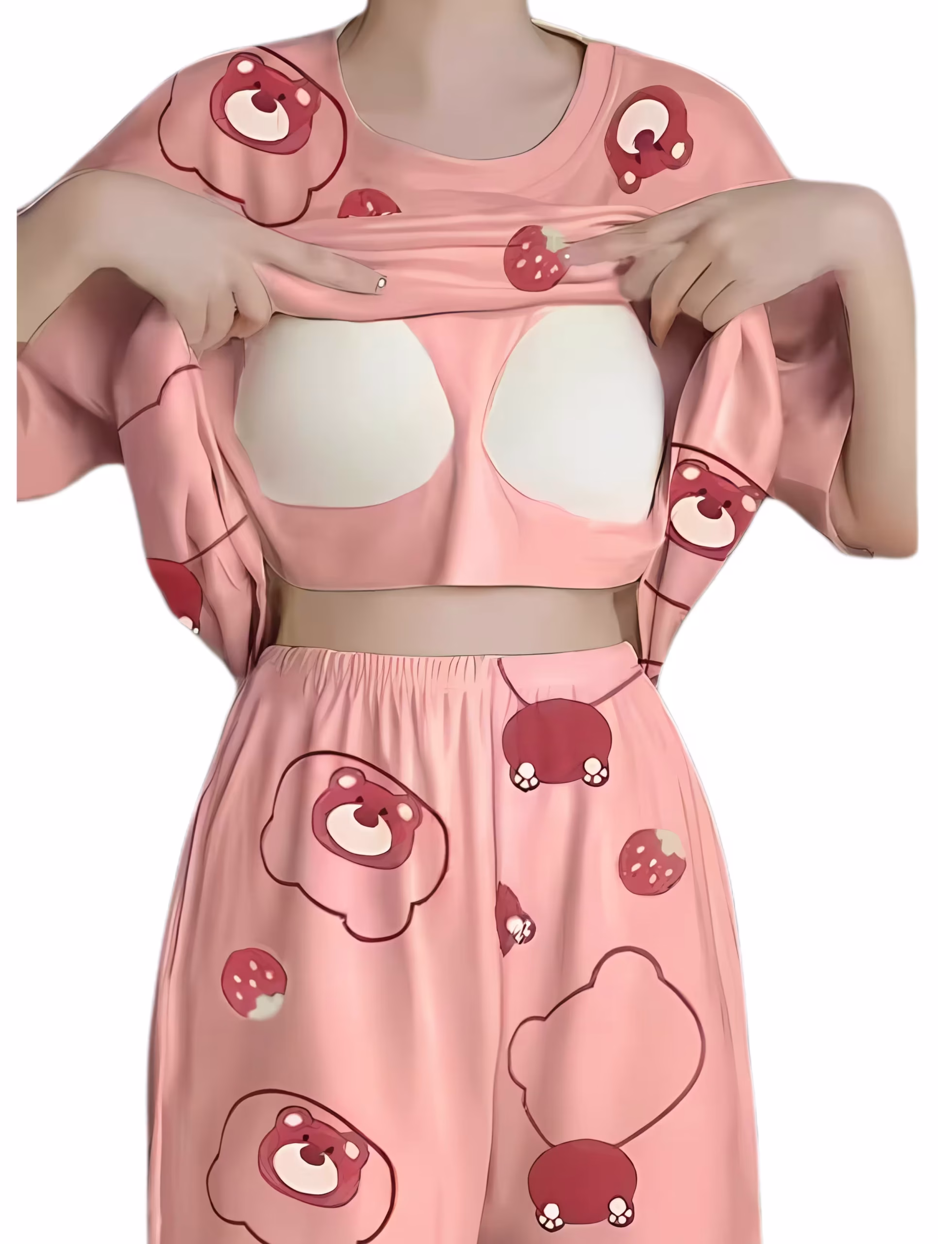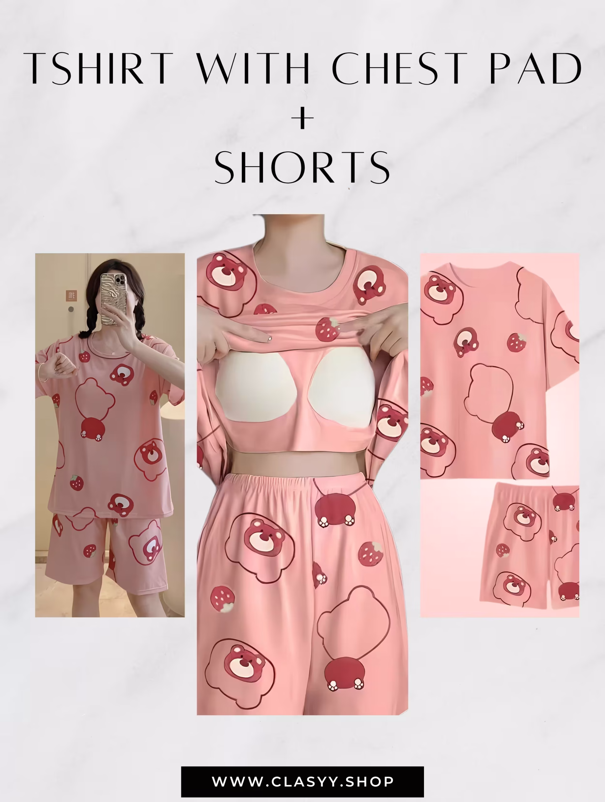 Women Summer Printed Short-sleeved T-shirt With Chest Pad + Shorts Combo Rose red strawberry bear