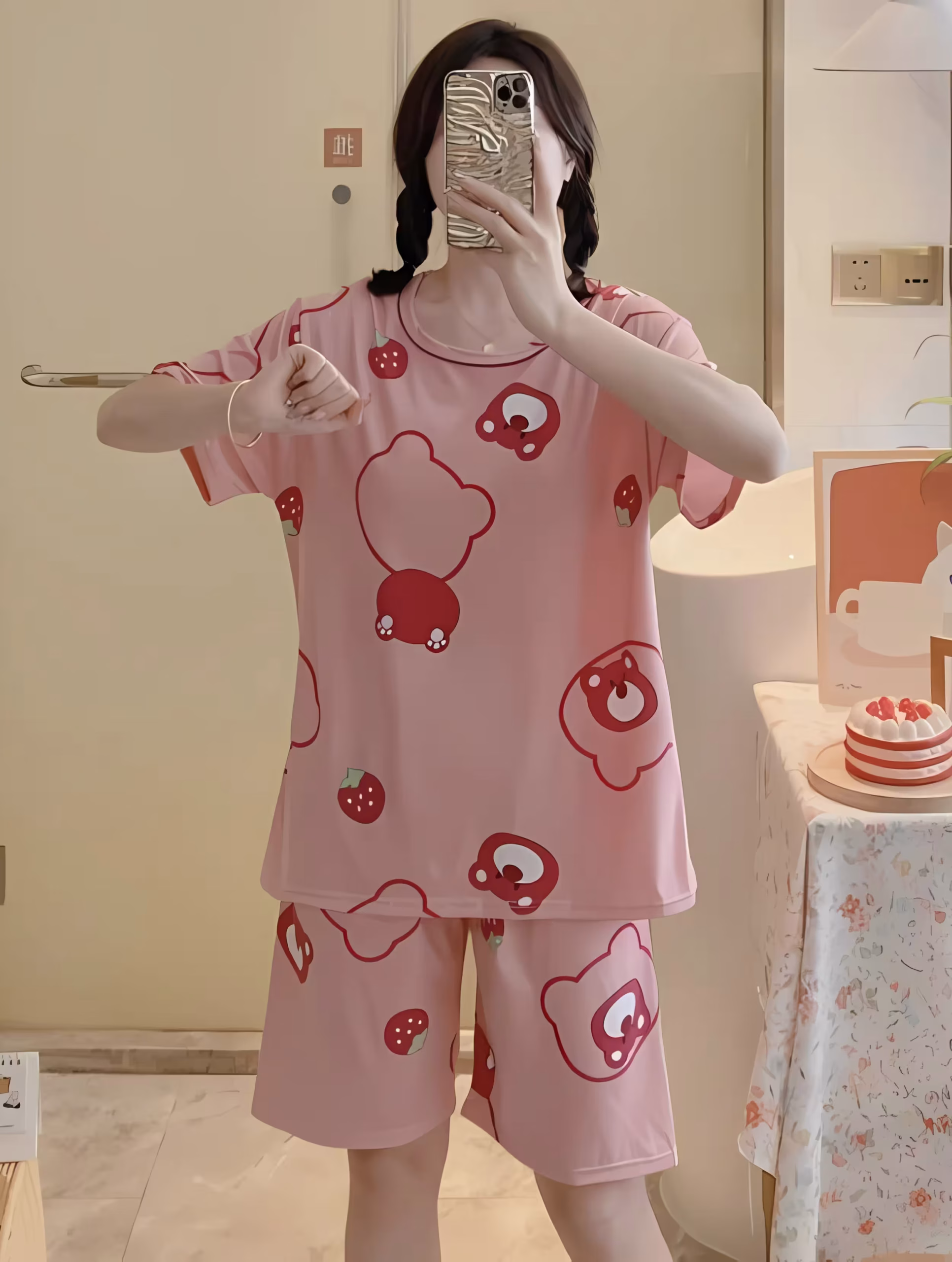 1 review for Women Summer Printed Short-sleeved T-shirt With Chest Pad + Shorts Combo Rose red strawberry bear
